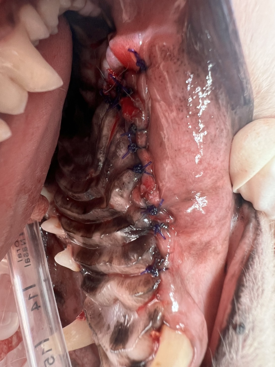 CT後にそのまま麻酔下にて抜歯を行い、鼻腔内を良く洗浄し抜歯窩を縫合しました。問題のあった臼歯はぐらつきこそなかったものの、歯周のポケットは歯槽の骨組織が吸収されてえぐれて深くなっており、周囲組織はとても脆い状態でした。