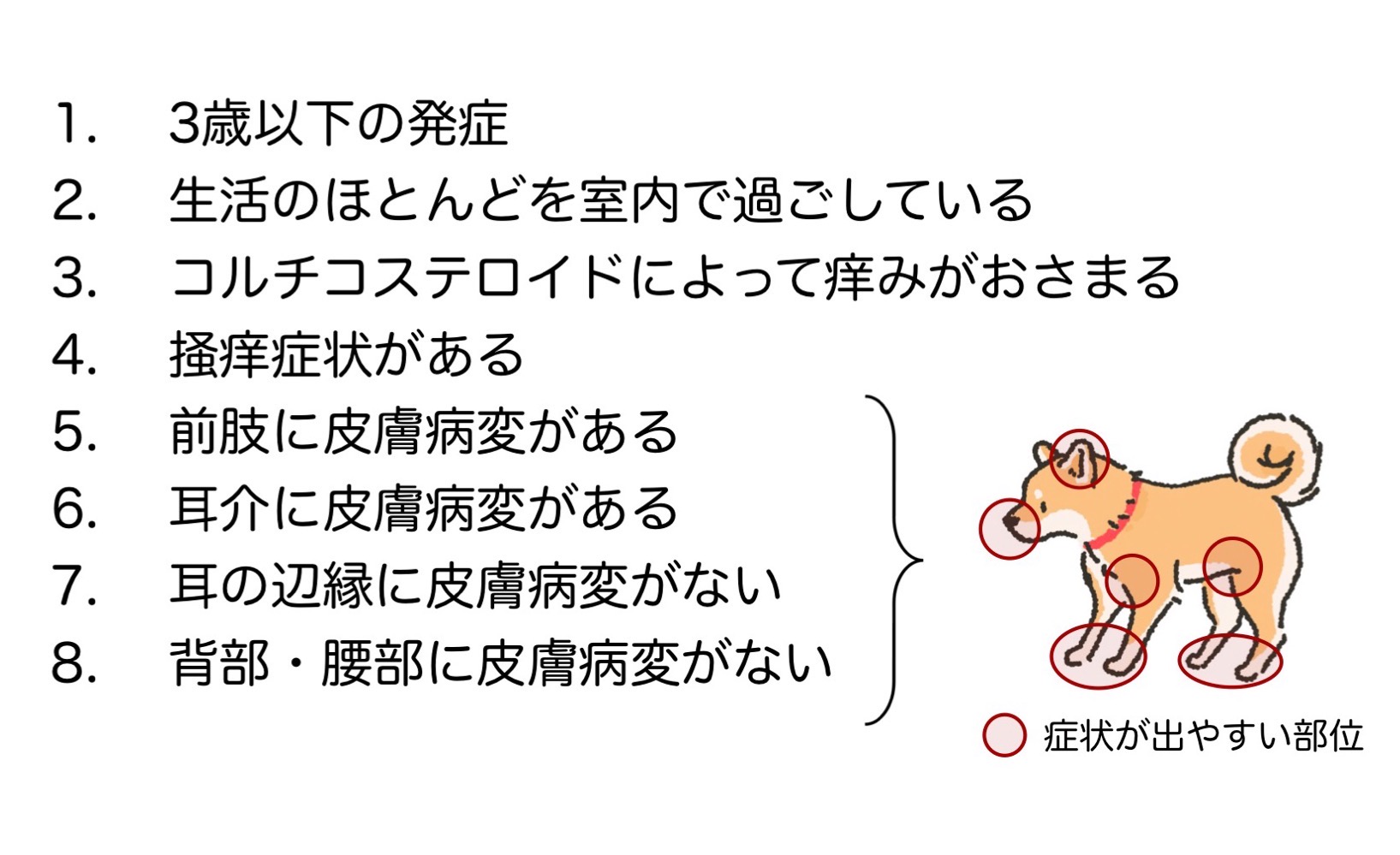 寄生虫や細菌の感染、食物アレルギーなどの痒みを特徴とする皮膚病を除外して診断します。