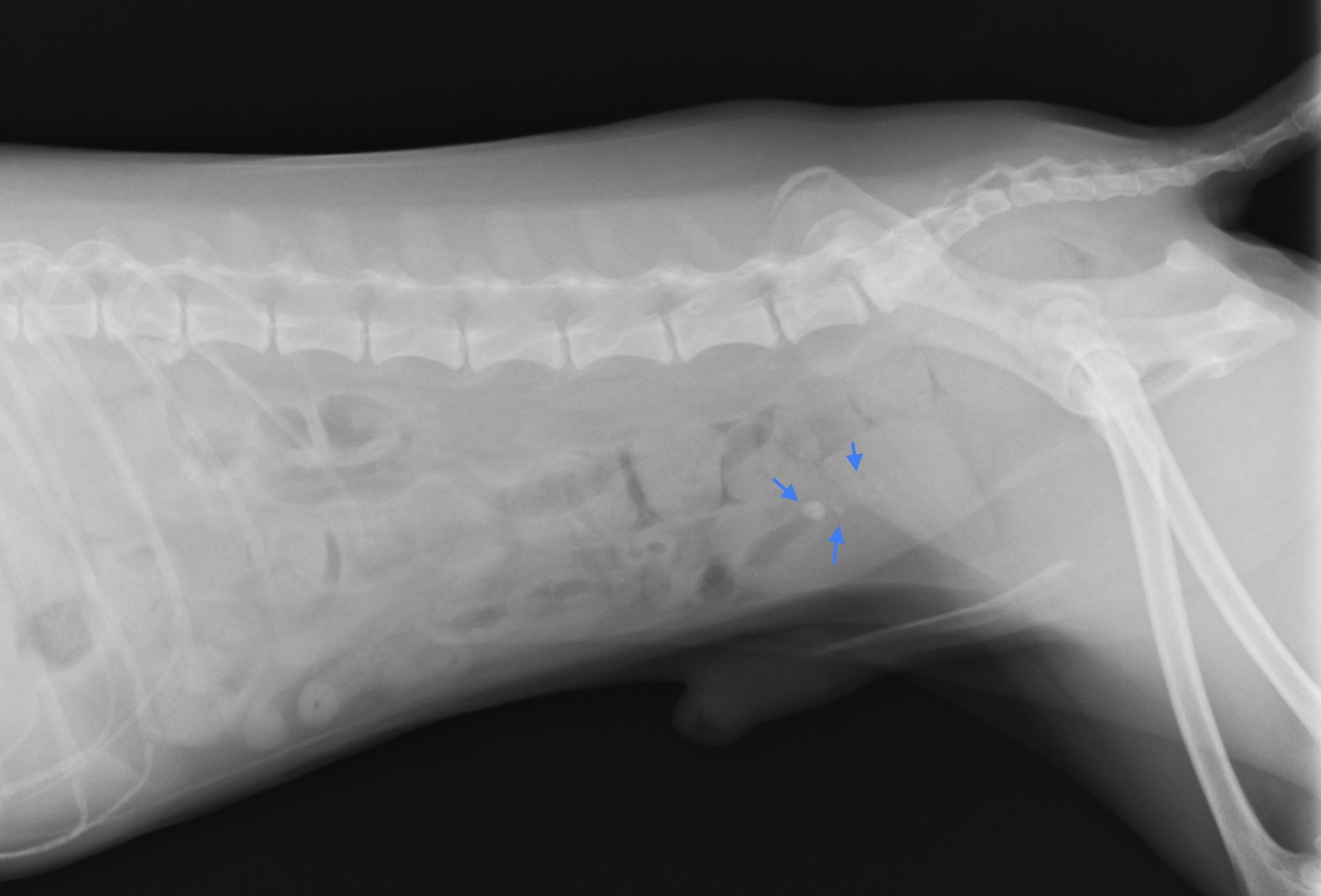 膀胱結石の手術経験があり、排尿の異常などはありませんでしたが、定期検査のレントゲン検査、エコー検査にて、膀胱内に多数の結石が認められました。