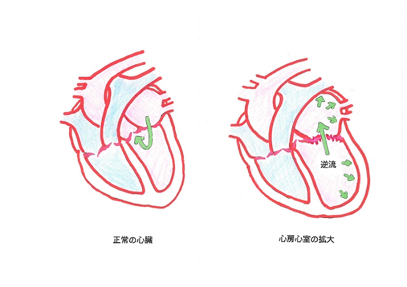 心臓弁が機能しなくなり血液が逆流すると、全身からの血流や肺への血流が滞り(=うっ血)心房や心室に負荷がかかり心拡大へと進行します。