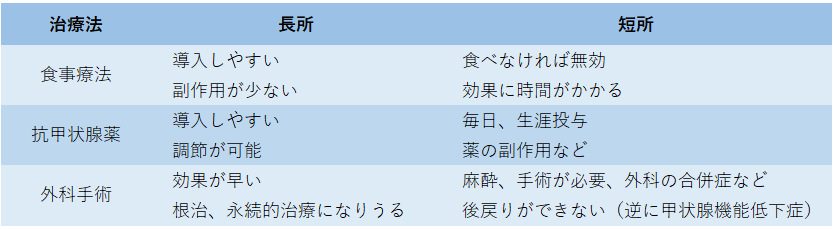 甲状腺機能亢進症に対する治療には現在 ①ヨウ素制限食、②抗甲状腺薬の投与、③外科手術による甲状腺の摘出 の3つの選択肢があります。いずれの治療においても甲状腺および各種状態の経過をモニターし、合併症を良好に管理することが予後の延長につながります。