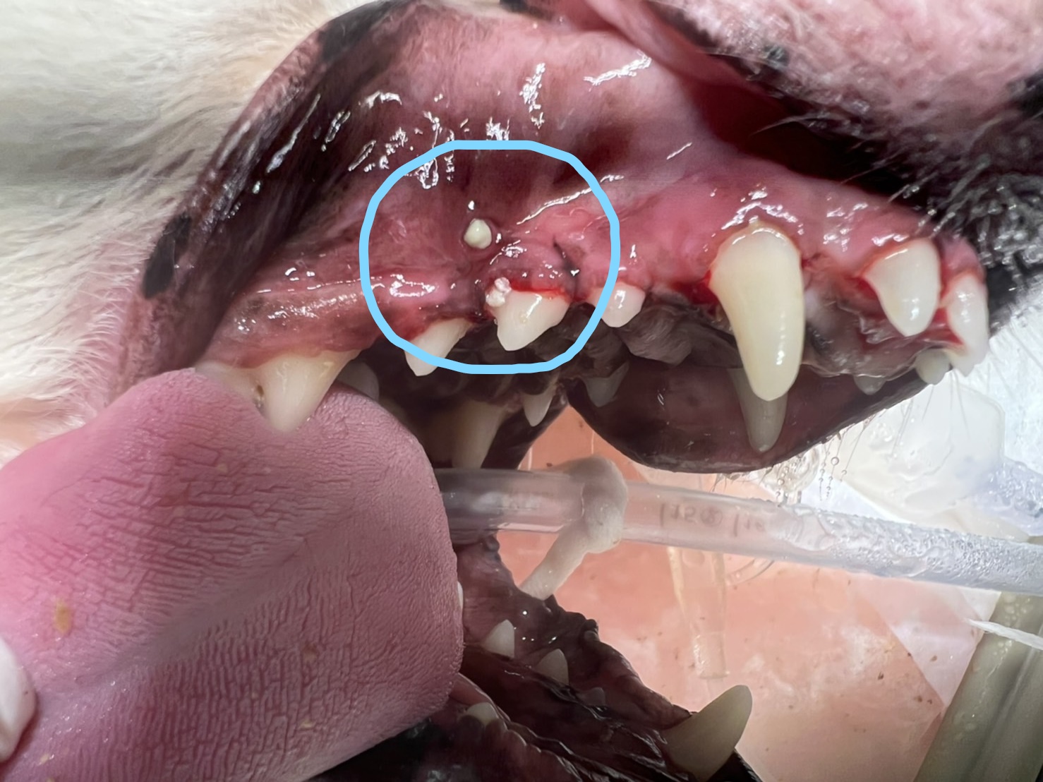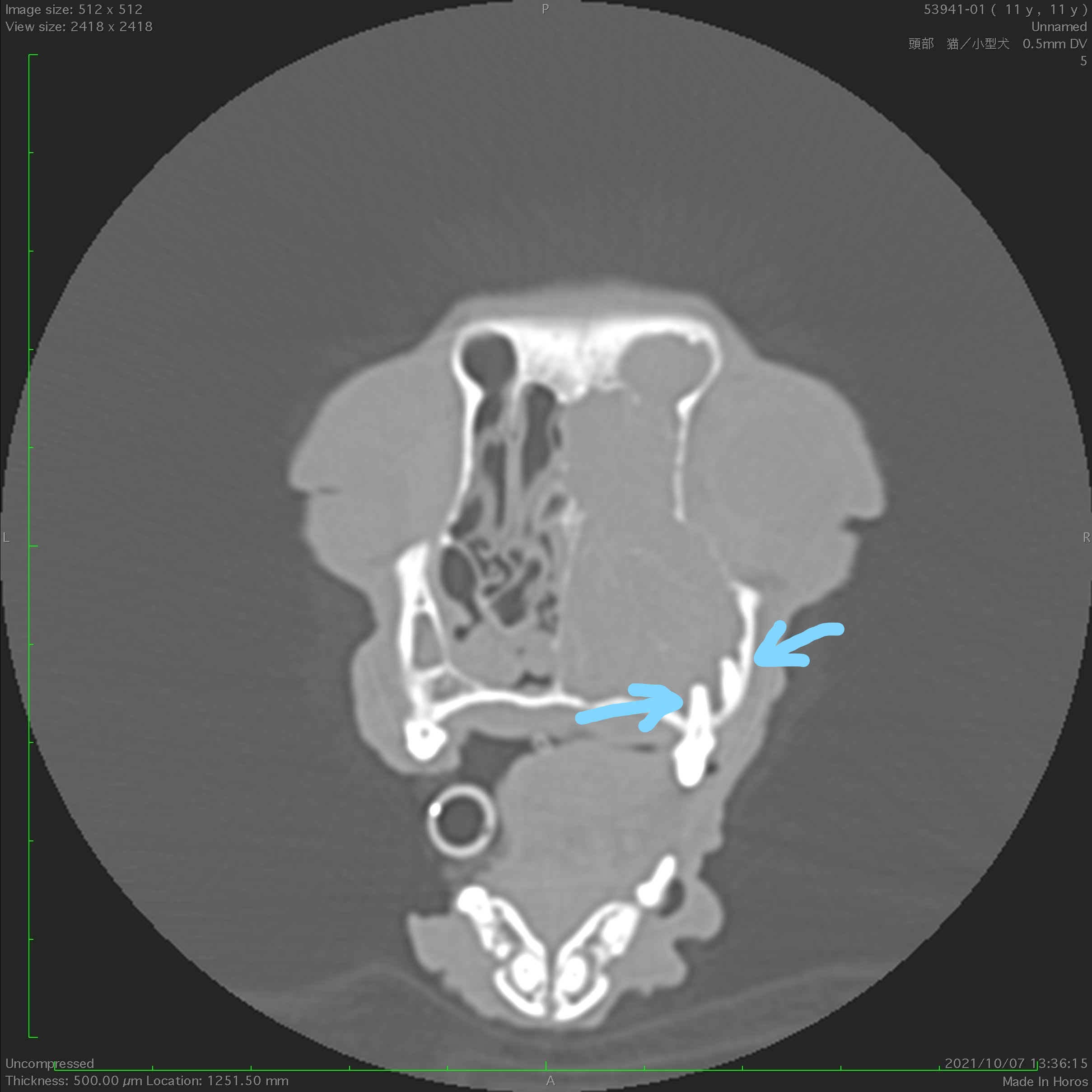 11歳チワワMIX 下のワンちゃんは歯周炎と目の下の腫れを主訴に来院されました。また、片方の鼻孔からの鼻水やくしゃみなどの症状がありました。見た目には歯石の量もそれほど多くなく、歯がぐらついているなどの所見もありませんでした。