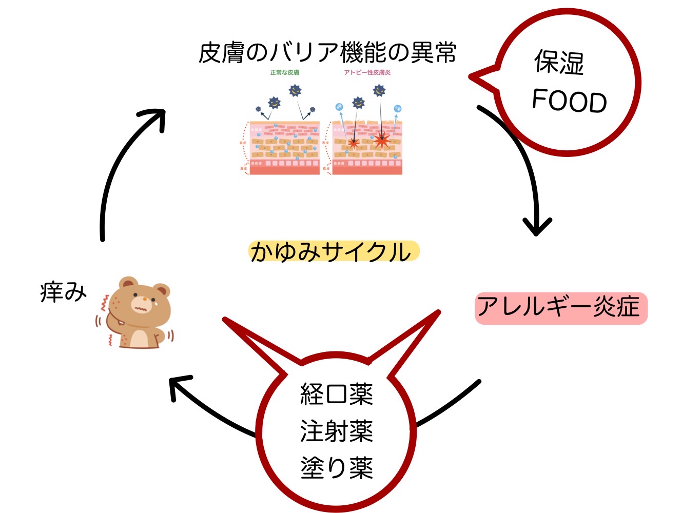 ✳︎痒みを感じることで掻いたり舐め壊したりすることで皮膚のバリア機能が低下し、環境中のアレルゲン(ハウスダスト・花粉)が侵入しやすくなり……と更なる悪循環がうまれてしまいます。