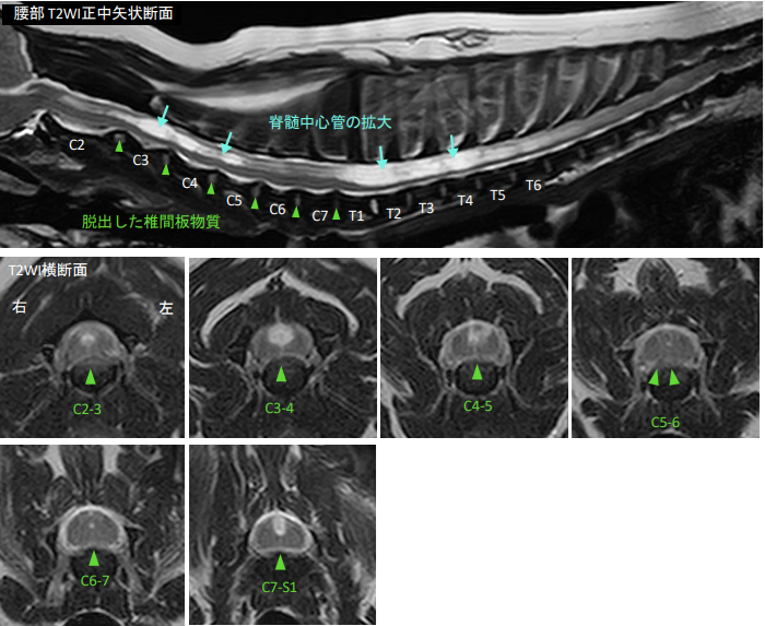 ↑頸部に多発性の椎間板ヘルニアが認められる