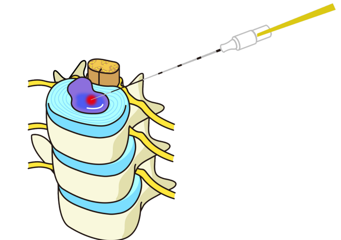 椎間板髄核にレーザーを照射し蒸散/空洞化 → 髄核内圧⤵ → 線維輪熱変性 → 脊髄圧迫を軽減