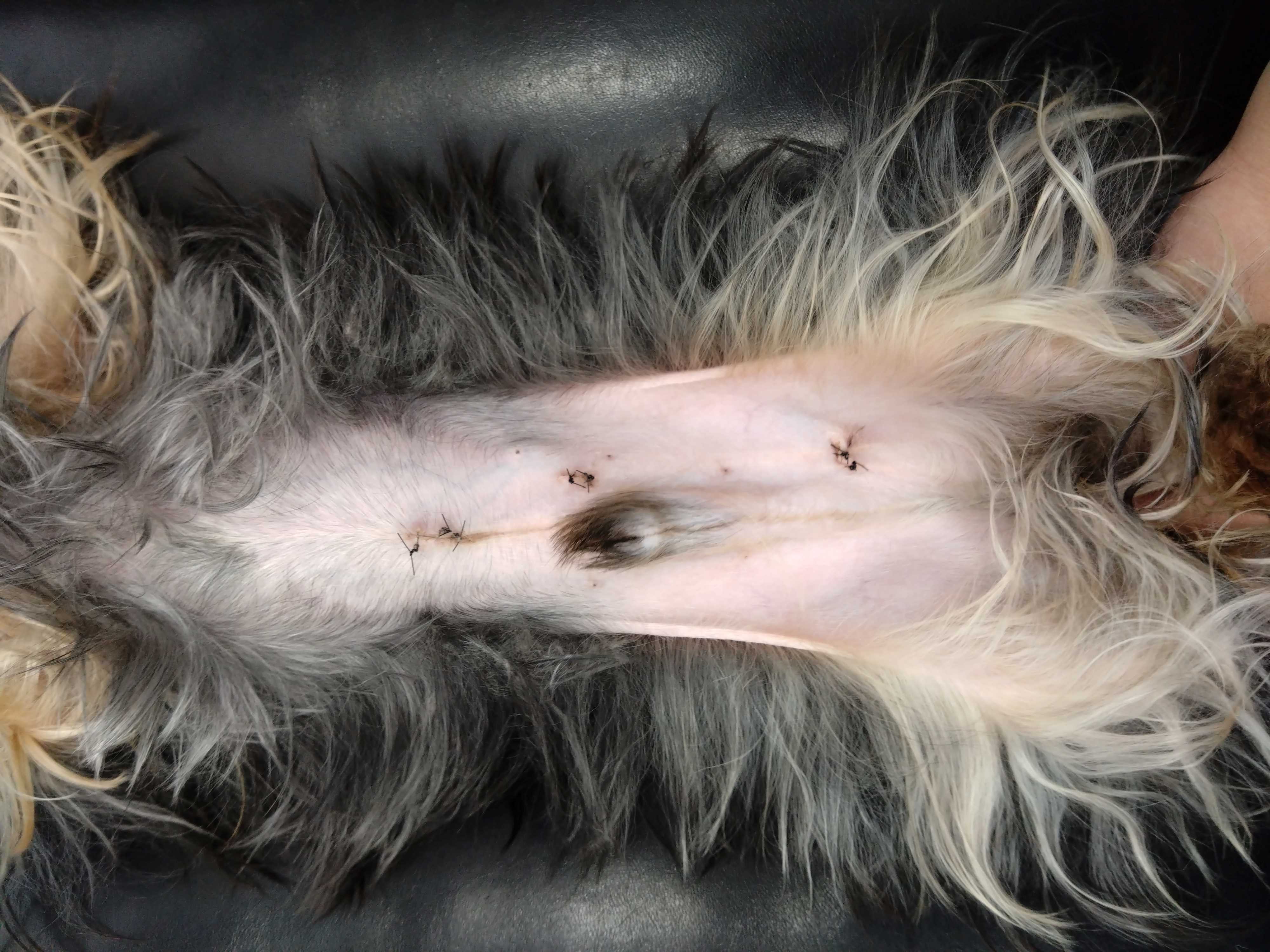上2つが腹腔鏡手術の跡(一番下の傷は反対側の皮下陰睾の摘出跡です)